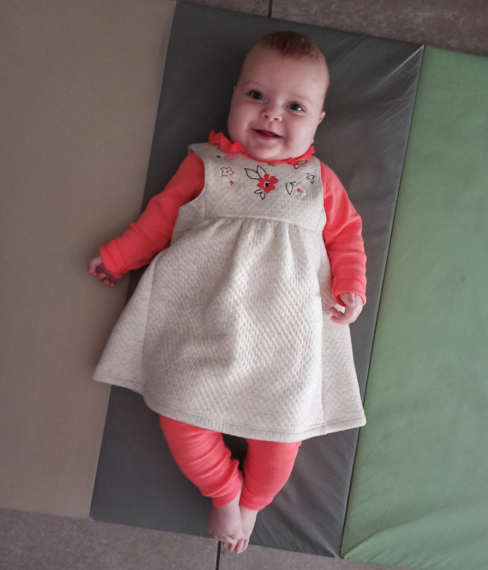 Et Violette est miss sourire. Bon fatiguée mais souriante. Bien sûr elle a hyper mal avec les quenottes qui sortent. Ce soir elle dormira dans sa chambre pour la première fois.