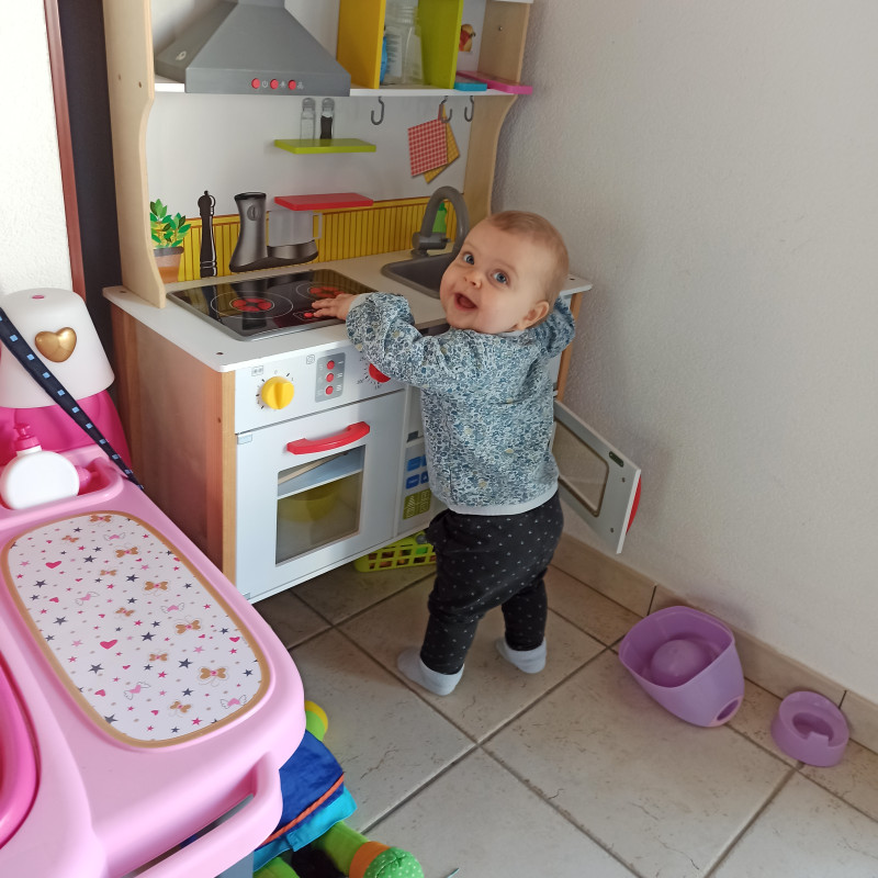Bébé est attiré comme Violette par les meubles où il peut se tenir debout et monter dessus ,il adore la grille de protection du poêle --" ou aller voir le chien . Le matin dès qu'il est réveillé ,il est en mouvement a se mettre a 4 pattes ,debout ,attrapé les choses sur la tête de lit . Quand il est comme ça ,je peux sortir tout ce que je veux ,il s'en fiche .