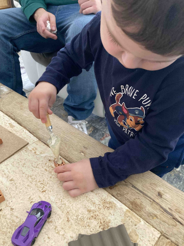 mais poser les briques ça va, repartir le ciment ça allait carrément aussi donc activité vraiment accessible en fin de compte, en duo avec un adulte.