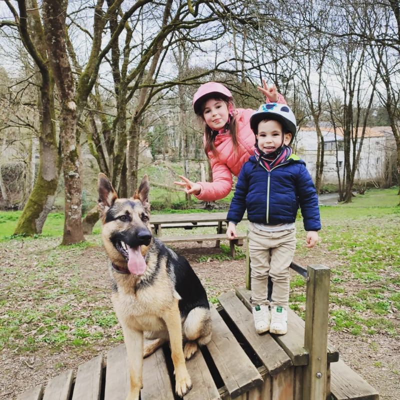 Ici, on a un chien (berger allemand). On l'a depuis tout bébé, donc il a grandi avec les enfants.