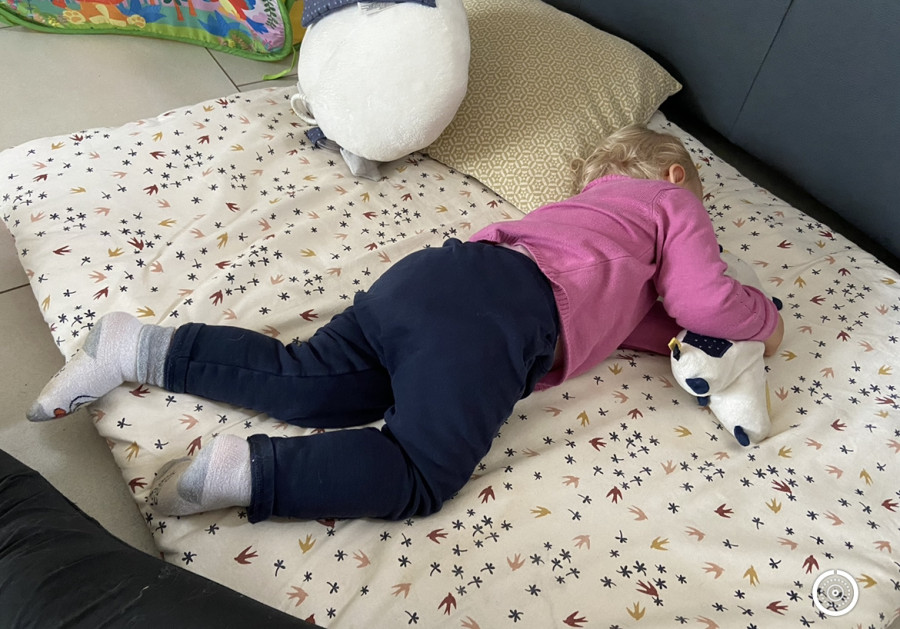 Toute petite est dormait dans le parc, puis dans nos bras, puis après etre passée par la phase ou elle s'endormait dans nos bras avant qu'on la pose sur la tapis, elle allait se coucher d'elle même dedans pour les siestes.