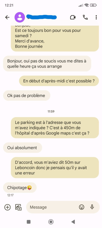 Ce matin je le recontacte pour fixer notre rencontre de samedi afin de récupérer la télécommande du portail pour accéder au parking et faire le trajet 1 fois et en checkant l'adresse, je me rends compte que le parking n'est pas à 50m mais à 450m. Je vous mets la capture d'écran de l'échange :