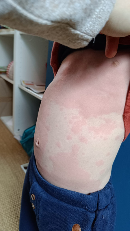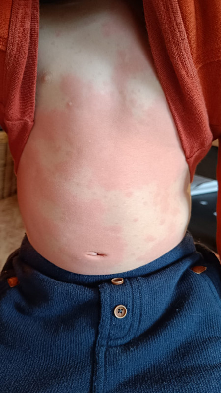 On est pas vraiment plus avancés... L'urticaire a légèrement réduit ce matin mais il a toujours de la fièvre et de la toux. Je me dis qu'il a peut être deux choses indépendantes, la fièvre en lien avec la toux (donc il nous faudrait une vraie auscultation pulmonaire) et l'urticaire qui serait une réaction allergique suite au savon....