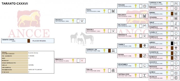 son père c'est GRACIELO (né en 1995) par FERTIL (le père né en 1986 qui je pense d'après le sigle à coté de son nom appartient à la Yeguada Militar) et par GRACIELA (la mère née en 1991)