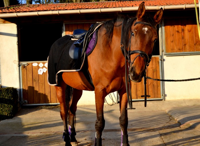 ... Et je prépare les affaires de Coup de Bluff à l'attache entre les boxs, puis je le sors du box. Vera est toute folle, je les laisse deux minutes se faire des bisous, et j'attache Coup de Bluff afin de le préparer. Pansage, je galère à lui mettre ses cloches sans scratch, protège-boulet, puis je le selle, lui mets son filet et direction la carrière. Je me mets en selle. C'est officiel, j'aime pas sa selle ! Je fais une détente tranquille au pas, puis au trot. Viens le moment de galoper, et sur ça on s'entends vraiment pas. Je mets plusieurs départs à faux, ou bien une foulée de galop puis il repassait au trot, avant de réussir à enfin galoper correctement. La détente finie, je fais deux fois le début de reprise de j'avais vu en cours, et je laisse sur ça. Je le fais marcher quelques minutes rênes longues, et je mets pied à terre pour le rentrer à l'attache. Je le désselle, lui fais son pansage, lui donne le bout de carotte pour le récompenser. Puis je le rentre au box, Angélique lui remettra sa couveture plus tard, il avait transpiré. Je range toute ses affaires, puis je vais faire un bisou à Vera en lui donnant sa carotte, et je lui dis à dimanche!