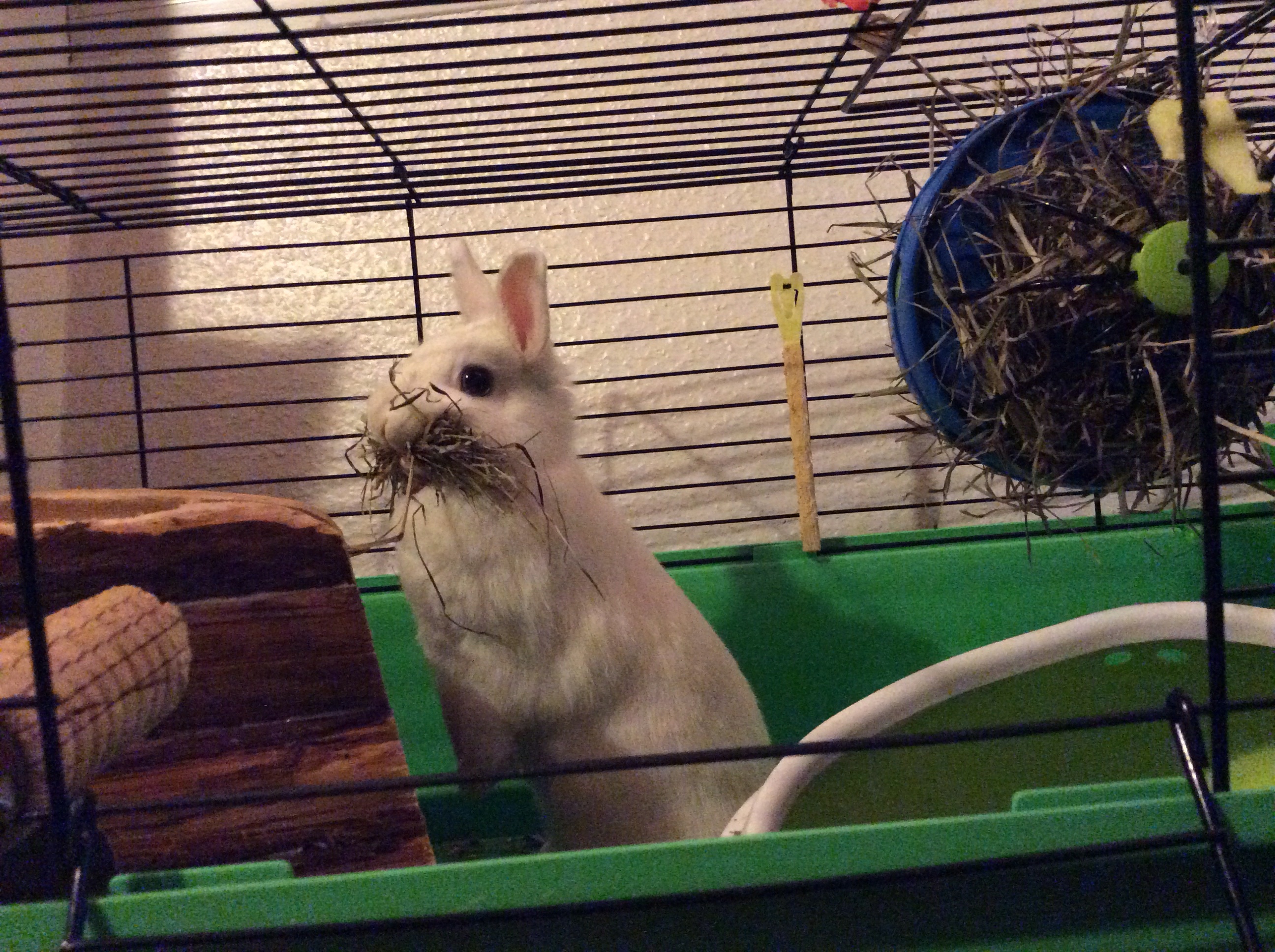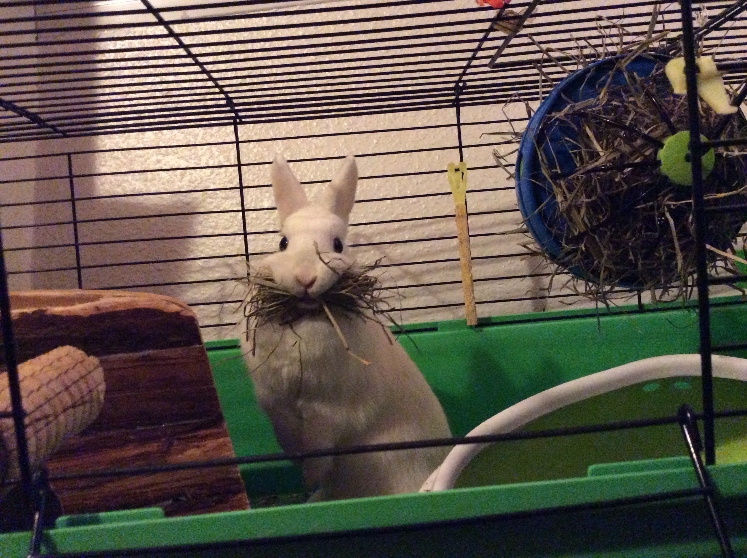 Maintenant, je ne fais plus de reproduction, il me reste 2 lapines qui finiront leurs vies à la maison. Une polonaise aux yeux rouges et une bélier nain cendré écru.
