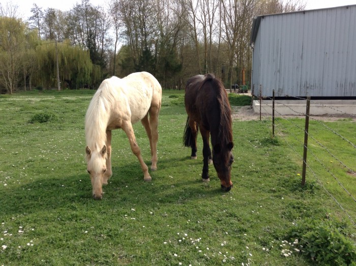 Les inséparables : dame de cœur (9 mois) et Câline 24 ans (demi sœur d'Aïda et poney D limite hors taille !)