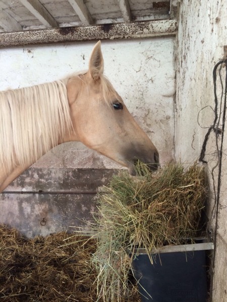 Aujourd'hui, il fallait remplir les râteliers de foin. Pause casse croûte très appréciée des filles. Bon, comme d'habitude Susie essaie de tout garder pour elle mais difficile d'empêcher les autres de manger au râtelier quand il fait 9 m de long