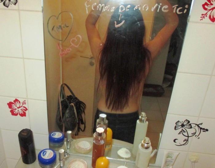 1ère photo (pas de commentaires svp sur mon miroir dégueulasse ) Alors, cheveux dégueu je vous préviens ^^ Là, ça passe encore !