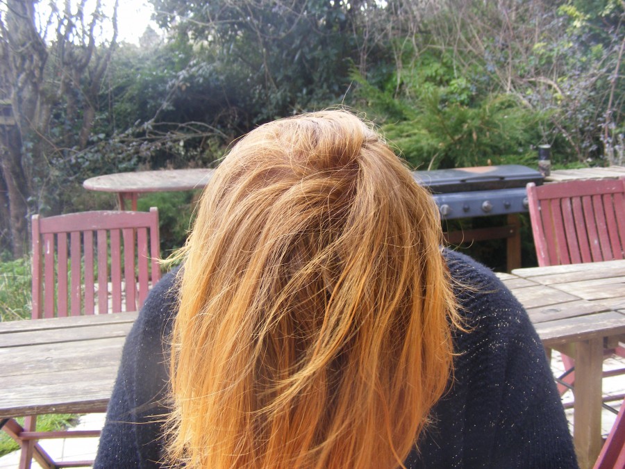 Je brûle ma méche, je brosse, j'applique de l'huile, j'attache d'un côté, et ainsi de suite. Après je fais un bon masque au yaourt en général, je lave, et c'est nikel. J'ai toujours de supers résultats.