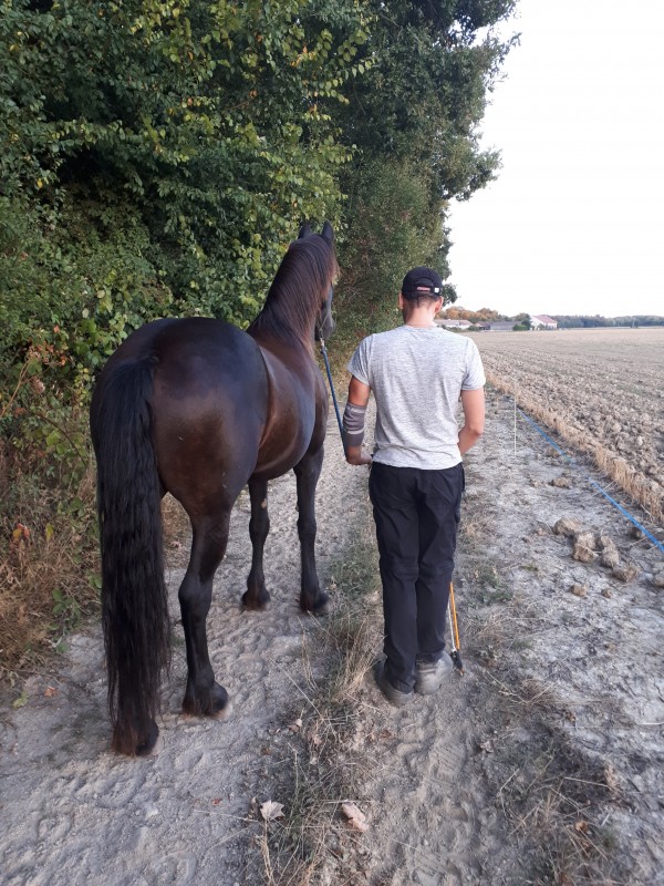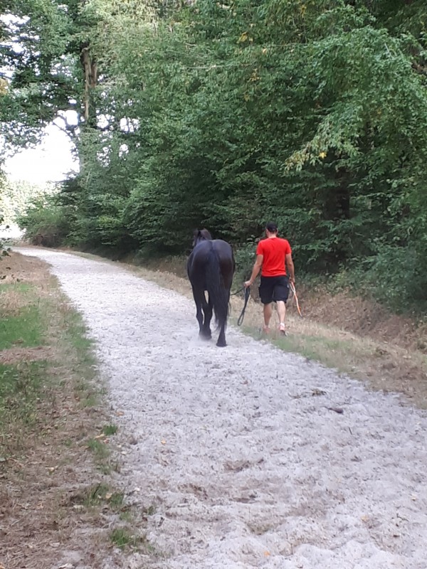 Pieter m'explique qu'ils le travaille dans ce sens et que le loulou a bien compris, il monte son dos et n'essaye plus de faire le trot relevé typique du frison à tout bout de champ.