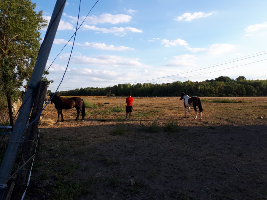 Vendredi : mon mari m'a accompagné. Un peu de TAP dans le manège pour que Bonhomme s'habitue bien. Il a été très à l'écoute, et allant. Il a bien mâchouillé donc RAS pour lui. On est ensuite parti faire le tour du champ derrière les installations.