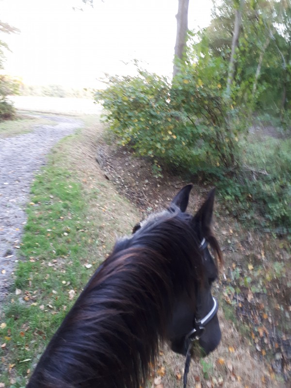 Bonhomme déteste se séparer d'un groupe en balade. Il a beaucoup regardé en arrière à ce moment là mais il est resté à l'écoute et on a continué la balade sereinement. Après 2 bifurcations, il était de nouveau zen et j'ai pu le galoper.