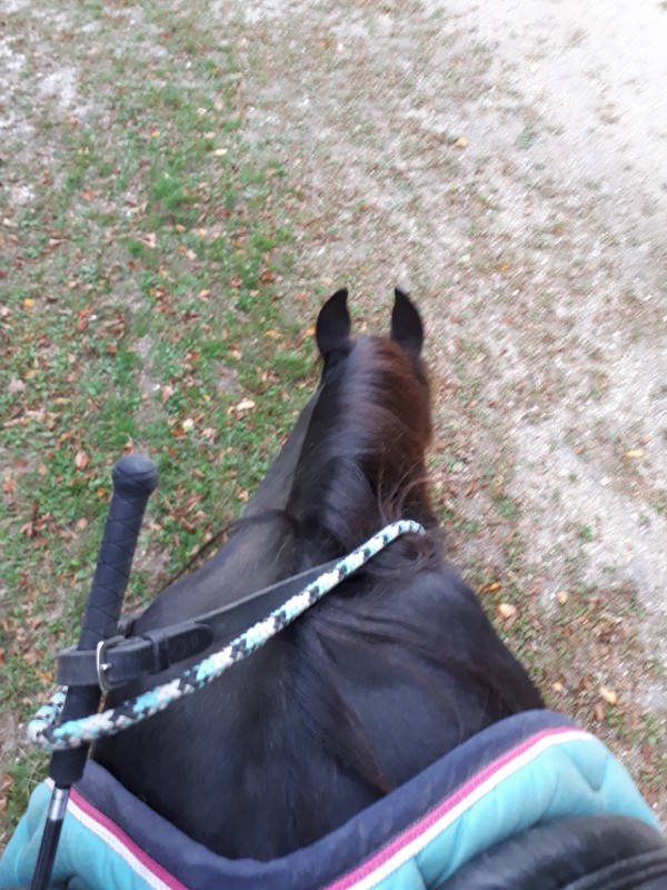 Bon par contre, vu que ce sont des lignes droites, et qu'il galère encore dans son équilibre sur de la durée, il se désunit au bout d'un moment mais du coup, il repasse au trot de lui même et je peux lui redemander le galop dans le calme.