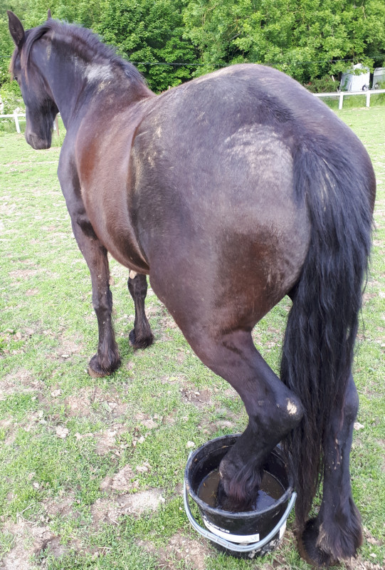 Lundi pas pu aller voir Frits et comme l'info de la réouverture de l'écurie est tombée tard, c'était mourru. Du coup, j'y suis allée hier soir et j'ai pu repasser à mon casier pour récupérer le bicarbonate de soude. Il a eu droit à un curage en règle et un bain des 4 pieds en liberté dans le pré. Il y a juste pour le PD qu'il a été pénible mais avec sa hanche douloureuse, je peux comprendre que ça le faisait chier.