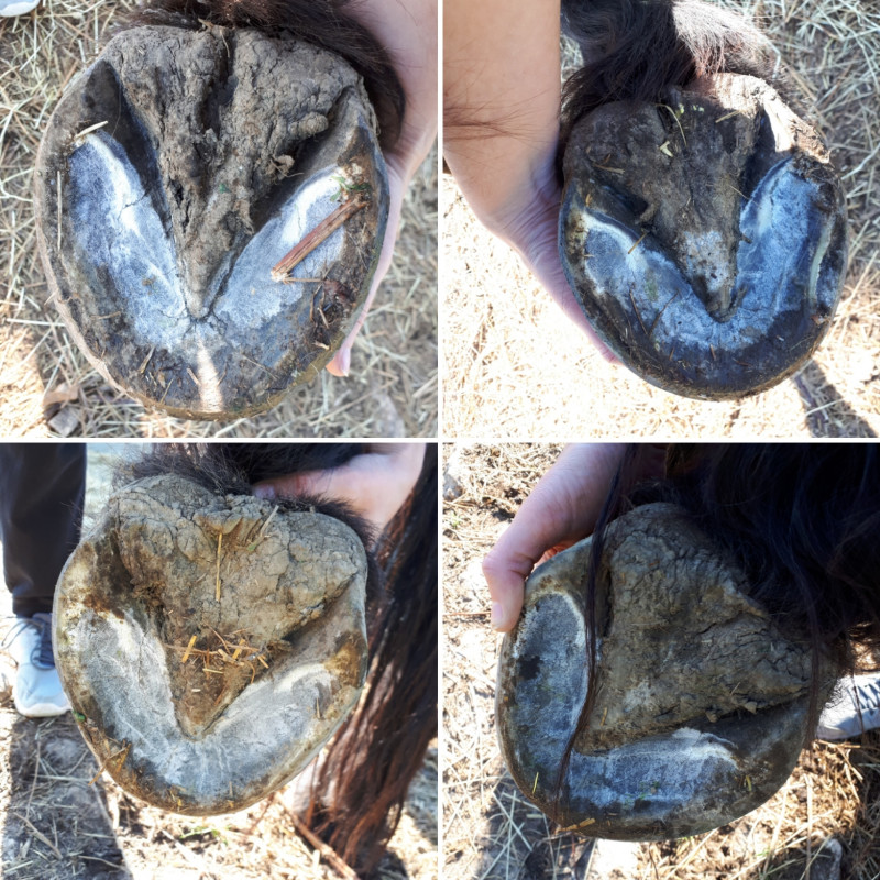 Au final, elle a enlever bcp de corne, bcp de sole morte. D'habitude elle y touche pas mais il y en avait vraiment pas mal donc elle a préféré faire un bon nettoyage pour que le pied respire bien. Mais la ligne blanche c'est encore la cata. 3 mois depuis le dernier parage, 6 semaines sans complément ... C'est déjà pas facile de l'entretenir en temps normal mais là, il a des décollements de psychopathe.