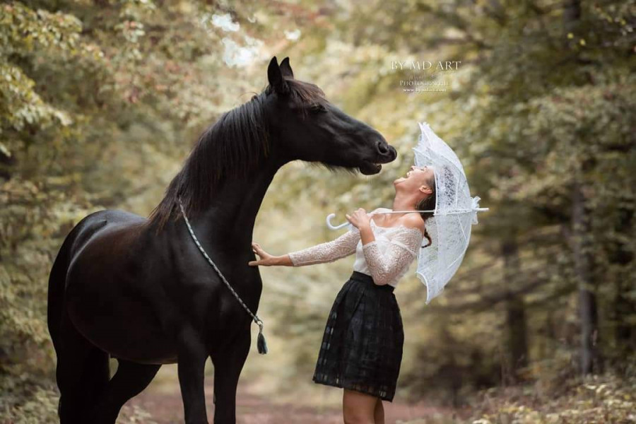 Elle a rigolé et a sorti qu'elle adorait qu'on la surprenne, elle aime bien les trucs décalés et que les gens se lâchent. Au contraire, elle aimerait avoir plus souvent l'occasion de faire des photos avec plein de tenues. A priori, elle s'est fait plaisir, elle nous a pas mal guidé (contrairement à la séance avec Elsa Meier en 2017, où on avait eu peu de guidage) et je pense que le rendu des photos va être très sympa. Et elle a adoré Frits, avec son coté curieux c'était hyper facile pour elle de l'occuper pour avoir des jolies poses. Elle n'a pas arrêté de le complimenter. Mon égo de maman poule a été comblé ^^ Elle allait même l'emmener brouter pendant que l'on se changeait, elle a proposé de le ramener à l'écurie après la séance photo, elle lui faisait des câlins, et lui il essayait de lui faire les poches histoire de changer. Bref, je crois qu'il l'a emballé en 2 min.