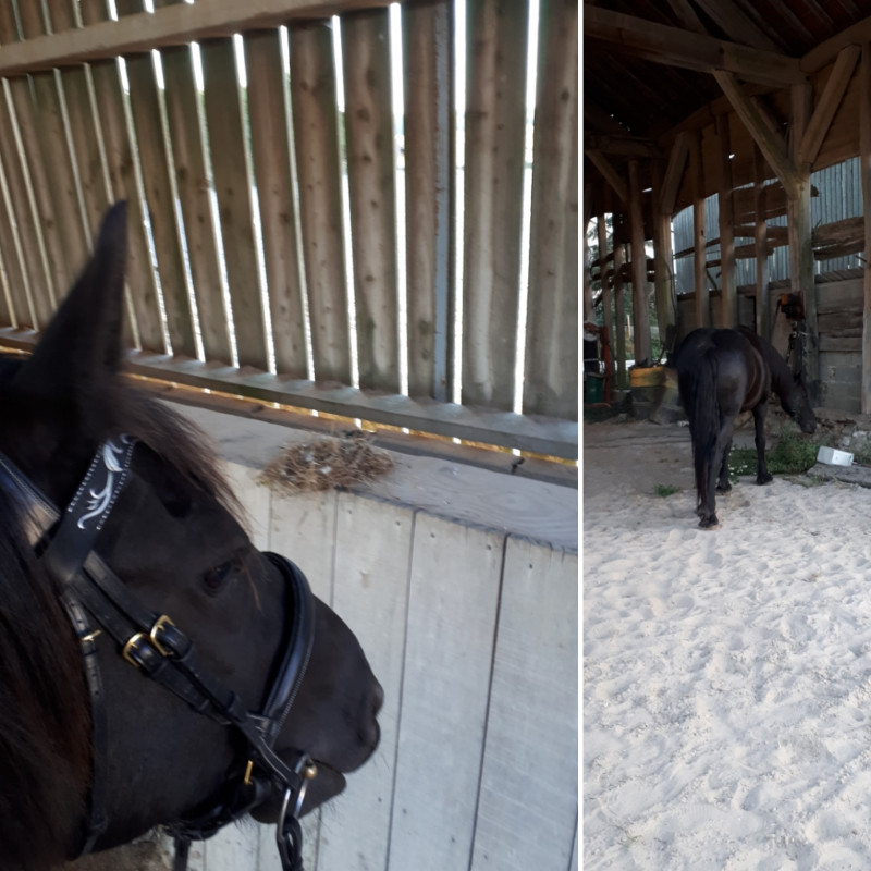 Je suis conquise et zhomme aussi a priori. On le ramène au box, on enlève la selle, le filet et il passe sous la douche. Il est adorable.