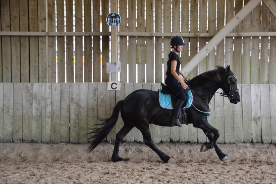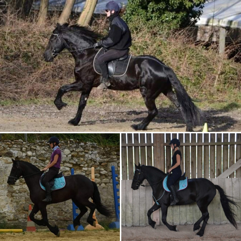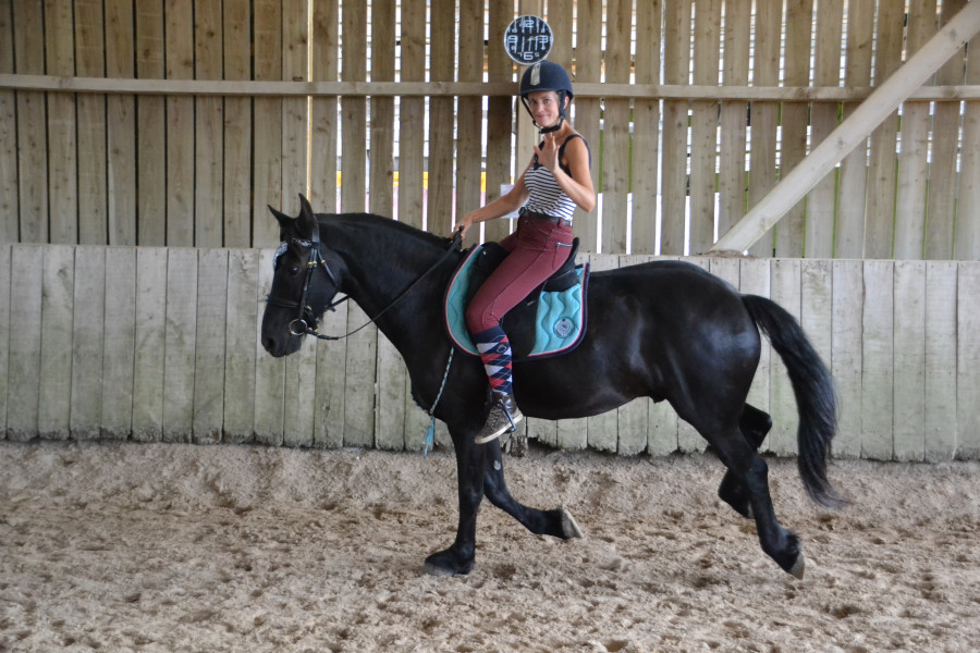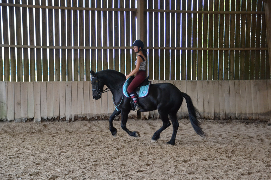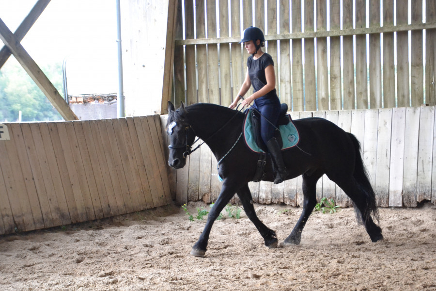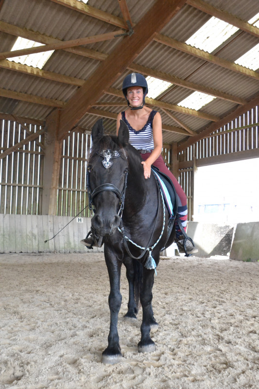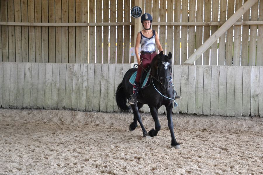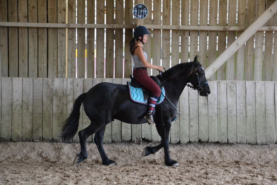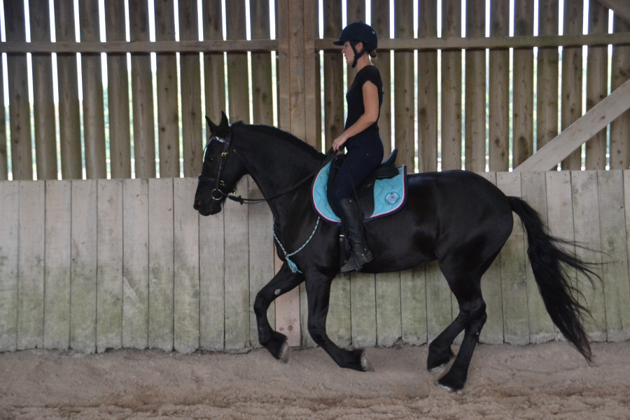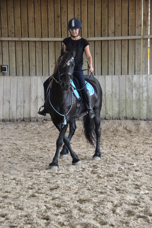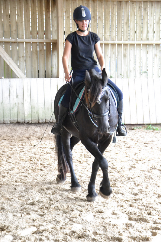 Pieter m'explique qu'ils le travaille dans ce sens et que le loulou a bien compris, il monte son dos et n'essaye plus de faire le trot relevé typique du frison à tout bout de champ.