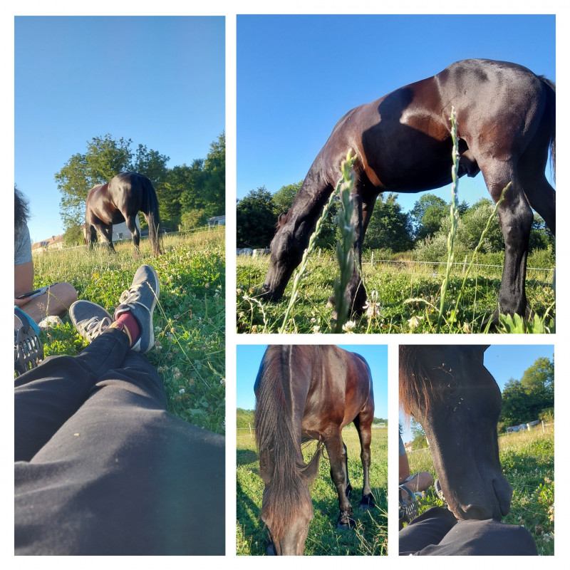 En fin de matinée je reçois un message d'une proprio de l'écurie pour me prévenir que son cheval (sa jument ?) intègrera notre troupeau au plus tard début de semaine pro, que ça fait plusieurs mois qu'il/elle est dans le paddock attenant au pré donc les chevaux se connaissent un minimum. Pas de souci, de toute façon j'ai pas mon mot à dire, je préviens juste A. la proprio des 2 juments.