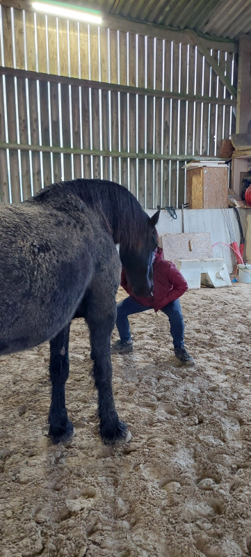 Pieter m'explique qu'ils le travaille dans ce sens et que le loulou a bien compris, il monte son dos et n'essaye plus de faire le trot relevé typique du frison à tout bout de champ.