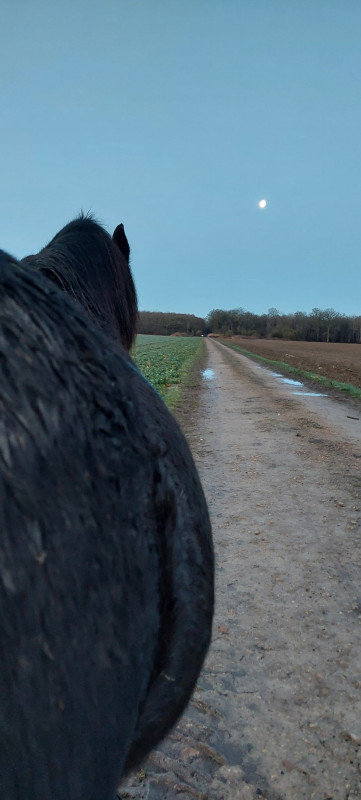 - Le 30 : petit passage avant un WE méga chargé. Du coup, petit tour à pied en liberté dans les écuries, de nuit. Frits pas hyper serein, mais on a bossé gentiment la détente et l'écoute. J'ai fait attention de ne pas dépasser ses limites et ça s'est très bien passé. A refaire pour voir s'il a retenu qlq petits trucs ou pas.