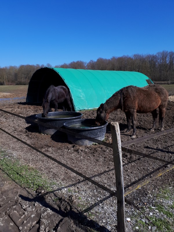 Du coup, en rentrant du boulot, je me change vite fait et je pars à l'écurie. J'arrive sur le chemin qui mène au pré et je vois 0 cheval ... La loose, ils sont encore partis au fin fond du pré. Je me décale un peu pour tenter de voir la partie cachée par le tunnel, et j'aperçois des culs !