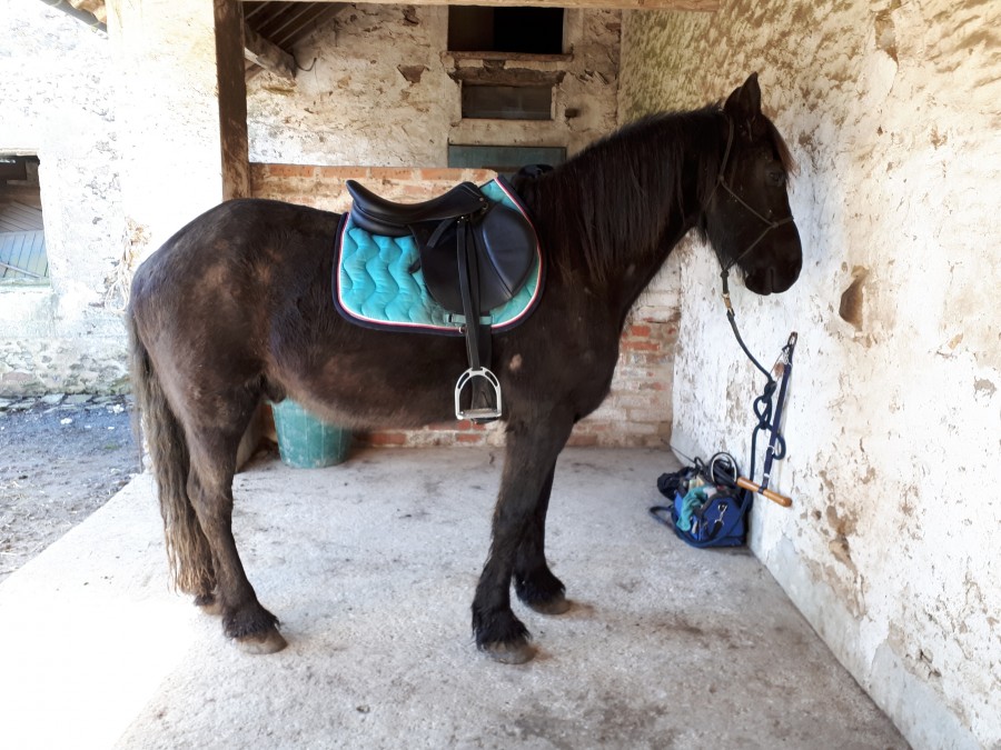 Je prends mon temps pour m'occuper de lui et une fois que tout est prêt, je selle et je lui mets le filet par dessus le licol. Objectif balade donc au cas où cela n'irait pas, pareil que la fois précédente, je veux pouvoir terminer à pied tranquillement.