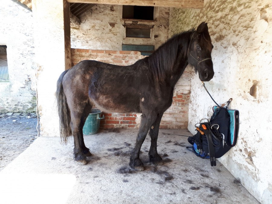 Je lui retire la boue, un max de poussière, je lui démêle la crinière (j'ai trop eu la flemme pour la queue), et j'inspecte tout. Il a beaucoup de zones de dépilations. Mais la shiatsushi la semaine dernière m'avait prévenu que ça pourrait arriver. Il en a des grosses sur l'avant-main et pleins de petites sur l'arrière-main mais les poils sont déjà en train de repousser. Je vais continuer de surveiller mais ça devrait rentrer dans l'ordre rapidement.