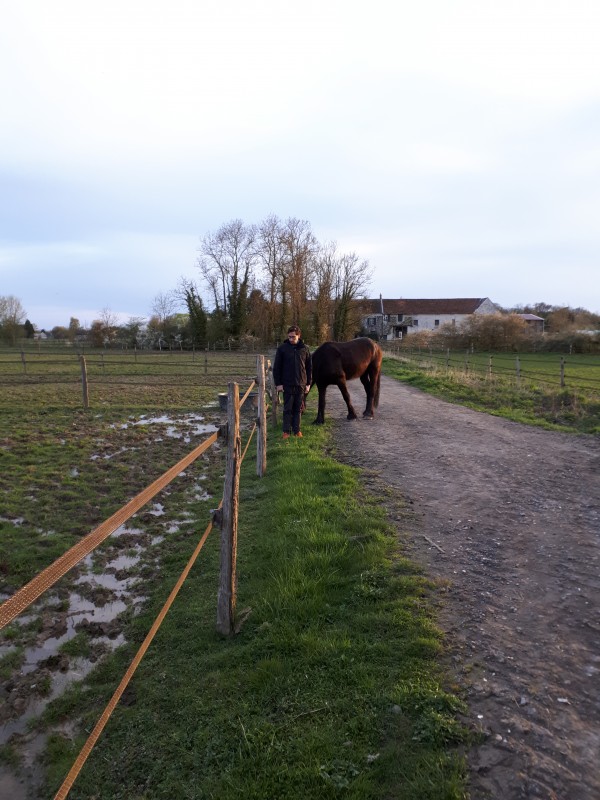 Sur le chemin de retour au pré, j'ai croisé le fils de la proprio. J'en ai profité pour discuter avec lui, et on a pris rdv pour un cour samedi après-midi. Il m'a posé plein de questions sur Frits, j'ai donné toutes les infos qui me sont revenus, ce qu'on fait bien, pas bien, nos défauts, ce que j'attends. Il m'a posé des questions sur mon matos car lui ne bosse qu'en filet et mors simple, ponctuellement en RA. J'avoue que ça m'a rassuré et lui aussi je crois bien !