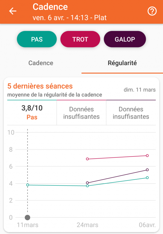Au niveau suivi de la séance, on progresse au niveau de la régularité des foulées surtout au pas et au galop. Le trot est un peu moins bon que la dernière séance, et la symétrie a baissée aussi. A surveiller donc, je ne sais pas à partir de combien la différence est significative (je vais me renseigner), j'espère en tout cas qu'il n'a pas de nouveau mal aux pieds.
