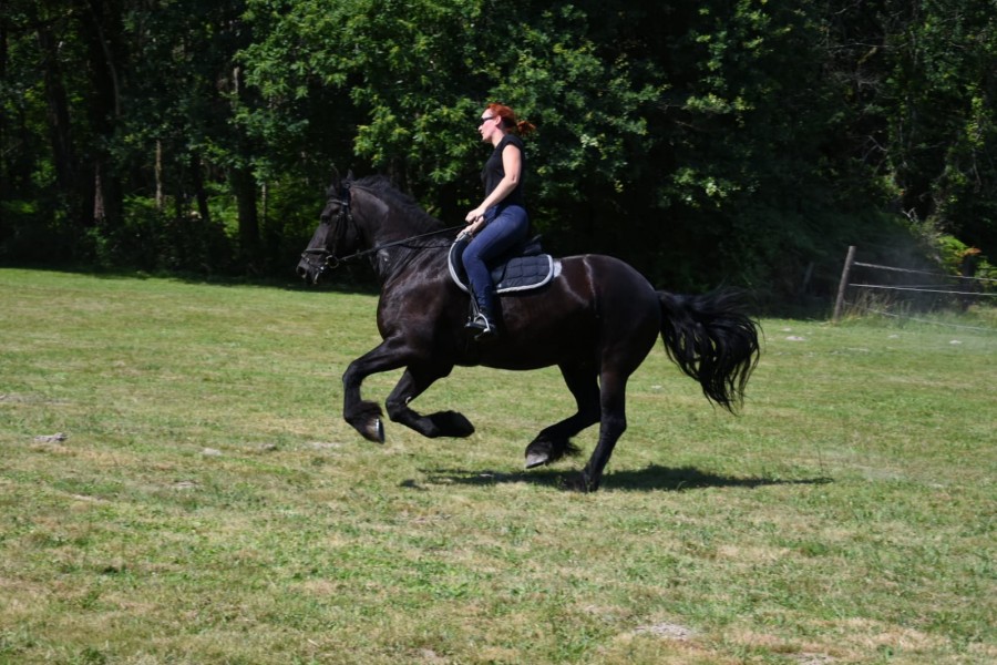 Pieter m'explique qu'ils le travaille dans ce sens et que le loulou a bien compris, il monte son dos et n'essaye plus de faire le trot relevé typique du frison à tout bout de champ.
