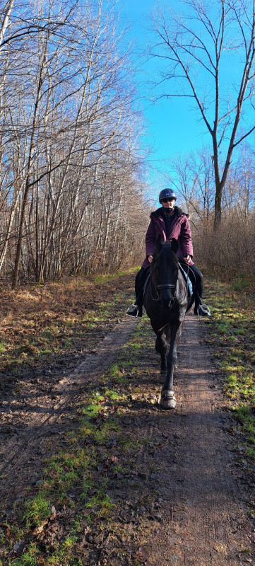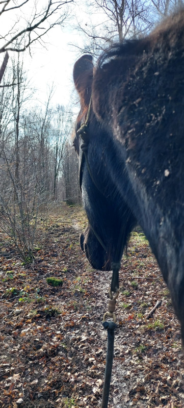 - Le 1er : balade en main en forêt. Je pense que ça faisait bien 1 mois qu'on n'y avait pas mis les pieds donc j'ai pas osé monté. Chéri a mis le tapis et a fait la première moitié de balade en mode baby-poney. Frits sage, 2-3 fois un peu surpris / attentif mais rien à déclarer. On a même fait un peu de hors piste en coupant par les sous-bois.