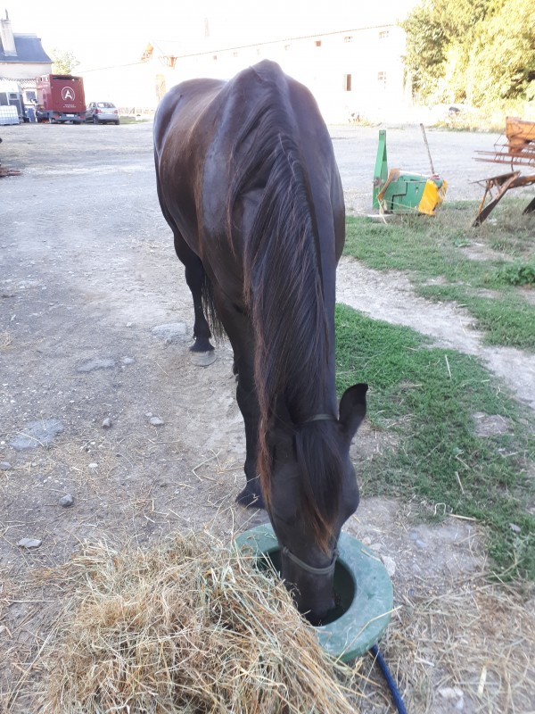 On ramène Frits devant le pré où sa gamelle l'attend. Il la mange plutôt bien, par contre il y a plus d'avoine que d'orge. A surveiller donc. On remet Frits au pré qui est un peu chassé puis il revient petit à petit et squatte un petit tas de foin qu'on a mis sur le coté en attendant qu'il ai sa place dans le troupeau.
