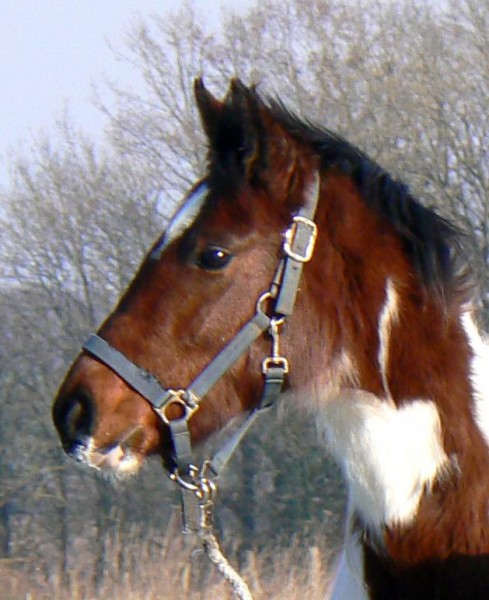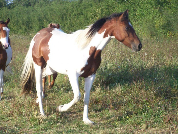 Arriva le jour où je me suis sentie de passer à la phase supérieur, j'ai passé 4 heures dans son box pour lui mettre un licol. Tout s'est passé dans la douceur, la jument n'était absolument pas stressé. J'ai décidé de la sortir au pré en licol, elle qui devait constamment suivre les autres pour se dégourdir les jambes.