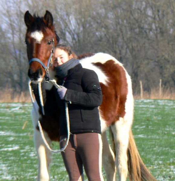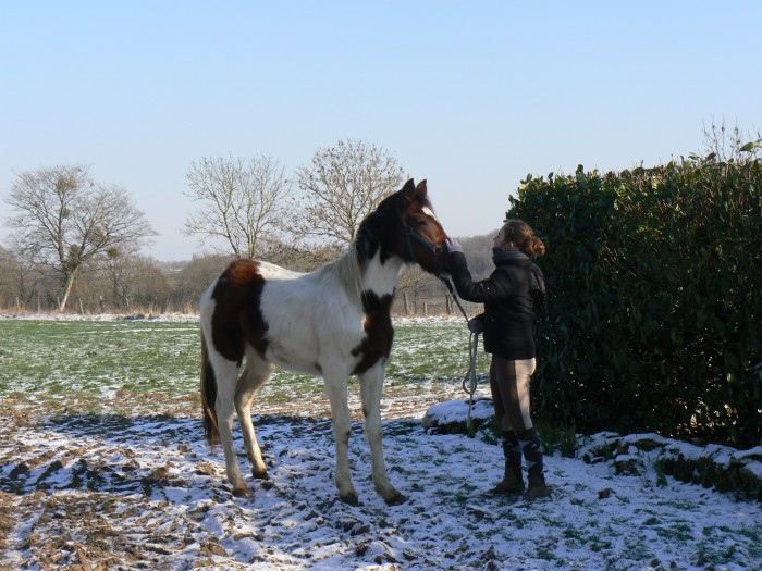 Puis est venu le jour où les éleveurs se sont séparés et avec chance, la mère de Kiona appartenait à l'éleveuse donc Kiona aussi. A partir de là, rentré au box pour la travailler puis pour l'hiver arrivant, nous avons pu commencé a vraiment établir quelque chose de positif. J'ai eu la chance de m'entendre particulièrement bien avec l'éleveuse du fait que je la connaissais depuis longtemps. Elle m'a donc faite confiance pour Kiona et m'a laissée la travailler seule. Ça a été bénéfique. Kiona commençait à laisser ses mauvais souvenirs de côté et redonner une seconde chance à l'humain. Je passais absolument tout mon temps libre avec elle, debout devant son box, plus tard dans son box .. Puis, elle a commencé à m'accepter et ne plus avoir peur dès que j'étais à proximité. J'ai donc commencé à vouloir m'accroupir, m'approcher puis peu à peu tendre ma main et la caresser. Quel moment magique quand j'ai enfin pu toucher du doigt cette merveilleuse pouliche