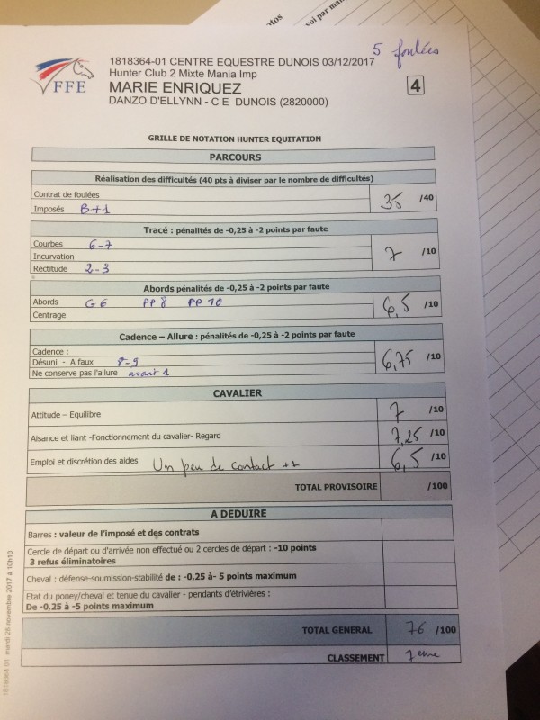 Aujourd'hui pour Zozo et moi, c'était tour de club 2 en hunter, toujours dans le même centre équestre où j'ai l'habitude d'aller! Un poney appliqué qui réalise quasiment tous les imposés (bon, sauf le contrat de foulée ^^'): transitions au trot, passages obligés, sauts en décalé, sauts de puce, sauts de biais... et tout ça sans faire de barres! Par contre une attitude très haute et crispée, et je n'ai pas réussi à le détendre et à le mettre en avant.