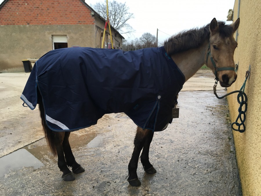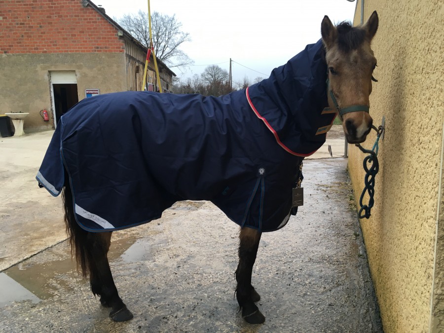 Danzo tout beau dans sa nouvelle couverture Premier Équine. Oui parce que monsieur poney a déjà fait 3 trous dans sa horseware toute neuve de cette année...