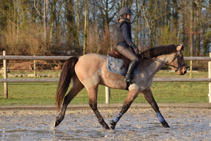 Tout de suite, il devient très proche de moi, me suit en main sans difficultés. Les progrès viennent très vite: douche du pied gonflé, pansage et curage de pieds qui deviennent une formalité, découverte de la carrière et de tous ses objets bizarres, remontée dans le van, premières balades en main… ça ne s'arrête plus!!