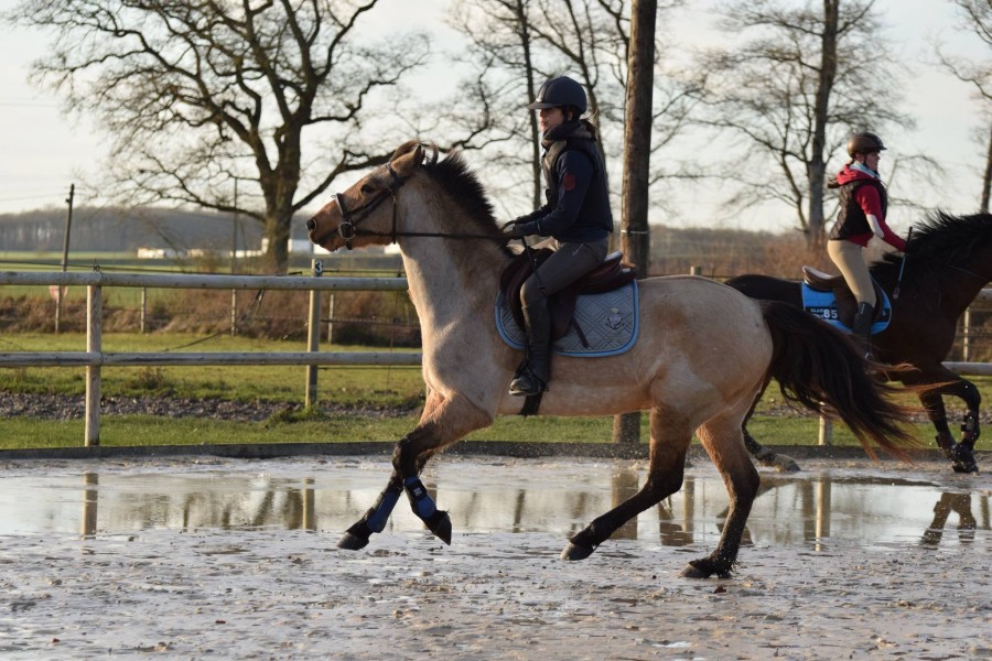 C'était vraiment un saut dans le grand bain pour Danzo, pour un premier concours extérieur, on peut dire qu?il aura eu de la nouveauté: les poneys partout, les vélos, piétons, parapluies, trottinettes, enfants, tentes? Pas mal stressé jeudi, il appelait beaucoup, trottinait, mais jamais rien d?ingérable, jamais de comportement excessif ou dangereux. Il a été sage à la préparation au van et sur le paddock, même s?il hennissait beaucoup. Et déjà vendredi c?était quasiment acquis. Il apprend vite le bonhomme.