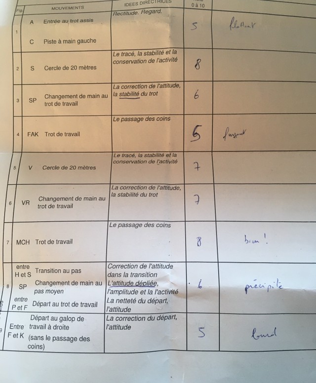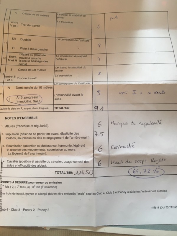 En dressage, le poney était super…. à la détente, lol. En avant, droit, réactif… génial! Et puis on entre dans le manège, et là, très impressionné par les lices de dressage, il regardait tous les plots des lettres. J’ai eu de jolis déplacements non demandés, mdr. Et il était très aspiré vers la porte, notamment sur mes doublés. Quand même du positif, puisque toutes les transitions sont réalisées plutôt proprement et précisément, et les tracés ne sont pas mauvais. Et au fur et à mesure il se pose plus et se concentre d’avantage, il se met dans l’exercice. Je pense qu’avec un peu de métier il sera agréable. Je sors avec 65%, c’est pas cata pour un premier je trouve.