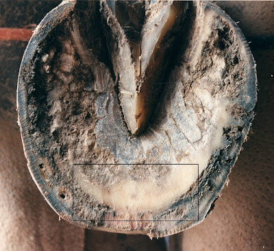 Là, il s'agit de ce que j'ai appelé "sub-fourbure", mais on peut avoir de nombreuses causes, y compris des parages spécifiquement "pieds nus" mais mal compris, c'est à dire inadaptés aux besoins réels du cheval.