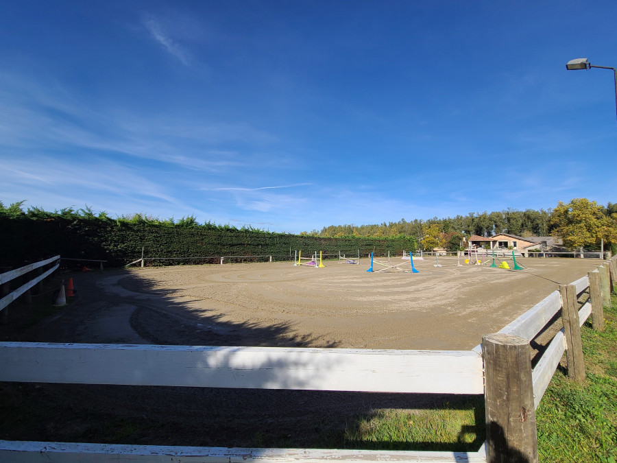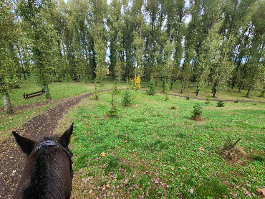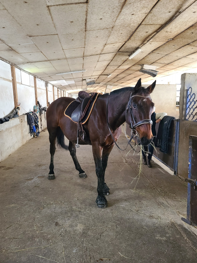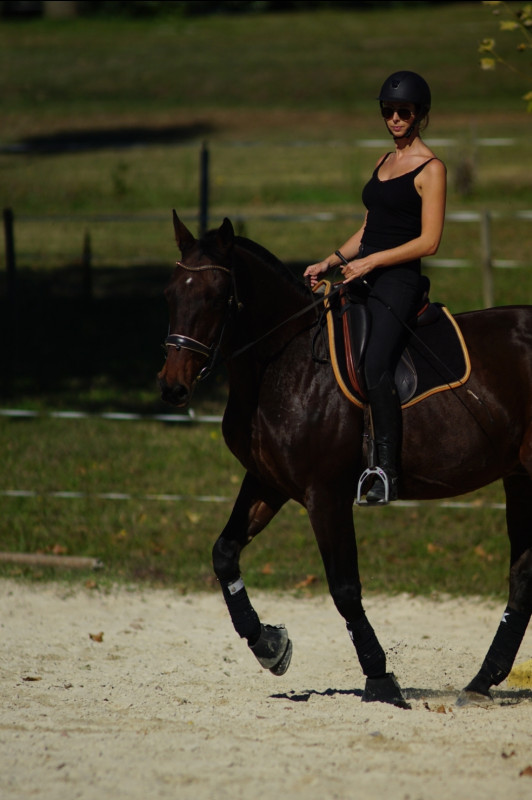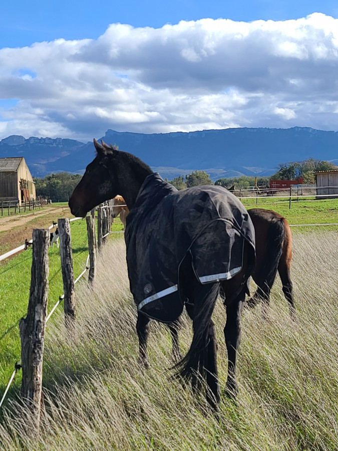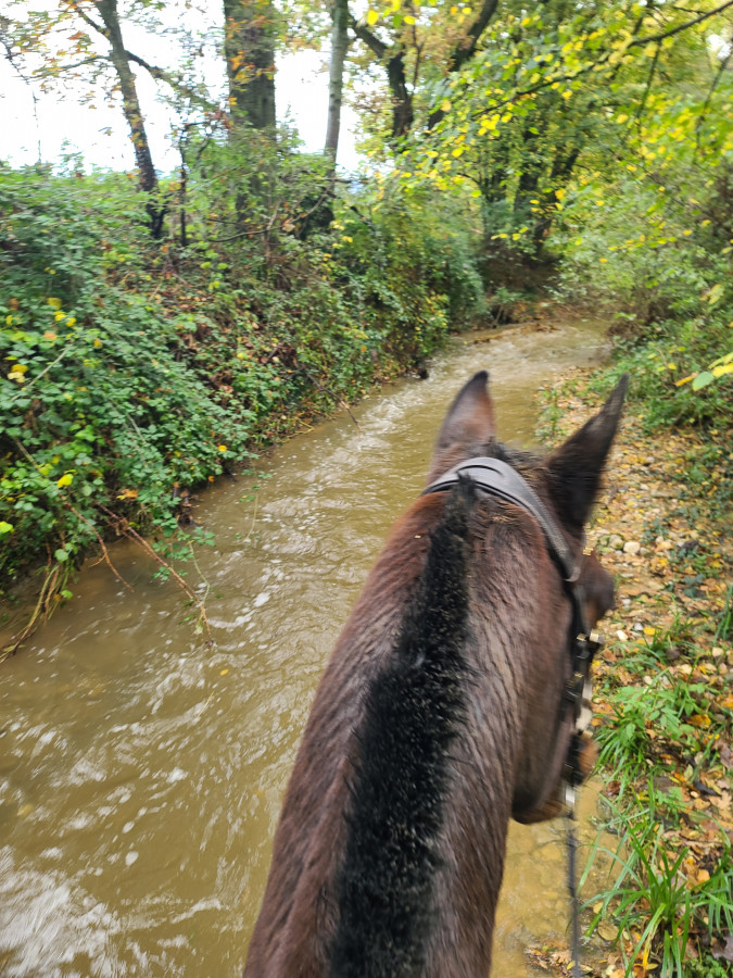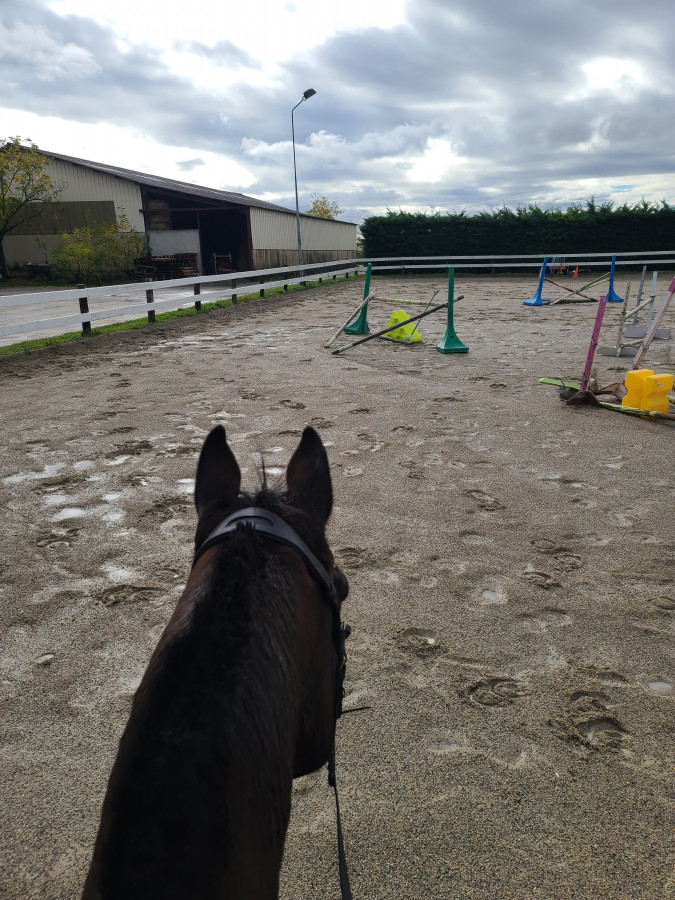 Malgré la tonne de pluie qu'on a eu cette nuit, les carrière sont étonnement plus que praticables, encore une fois, méga chouette. Du coup j'ai testé celle de saut, on a sauté 2 3 fois un petit croisillon pour lui faire plaisir et on a bien bossé, hyper léger, en avant, rond, réactif, du bonheur