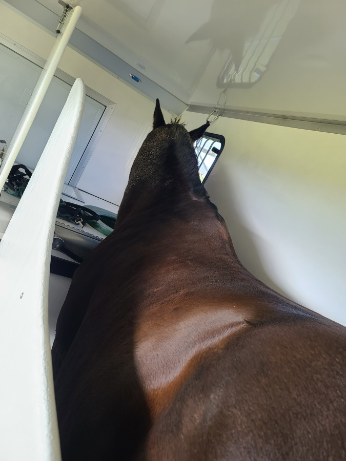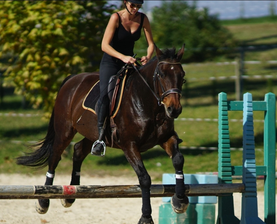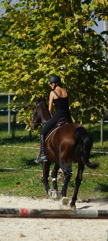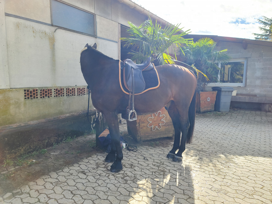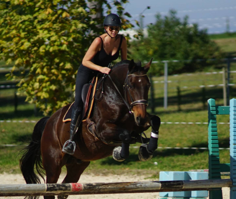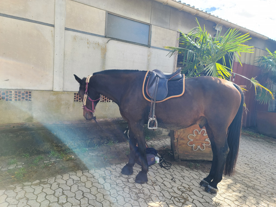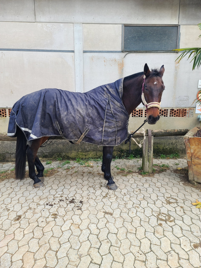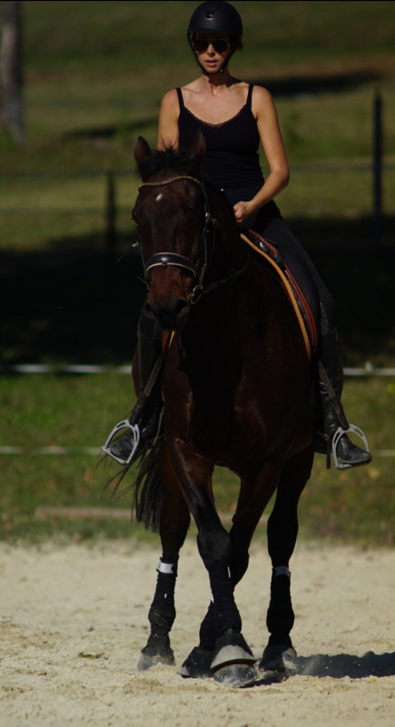 Malgré la tonne de pluie qu'on a eu cette nuit, les carrière sont étonnement plus que praticables, encore une fois, méga chouette. Du coup j'ai testé celle de saut, on a sauté 2 3 fois un petit croisillon pour lui faire plaisir et on a bien bossé, hyper léger, en avant, rond, réactif, du bonheur