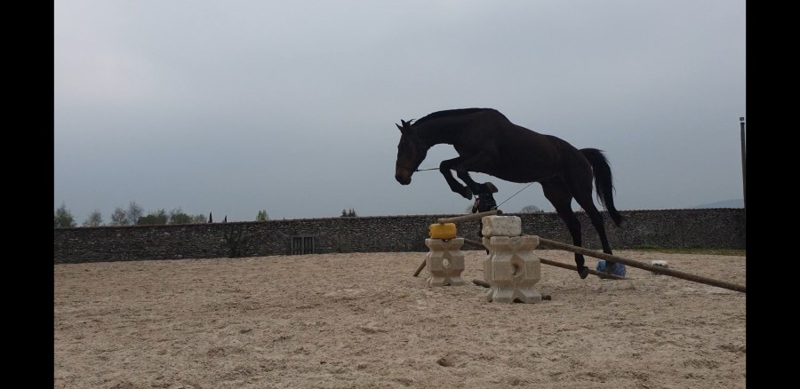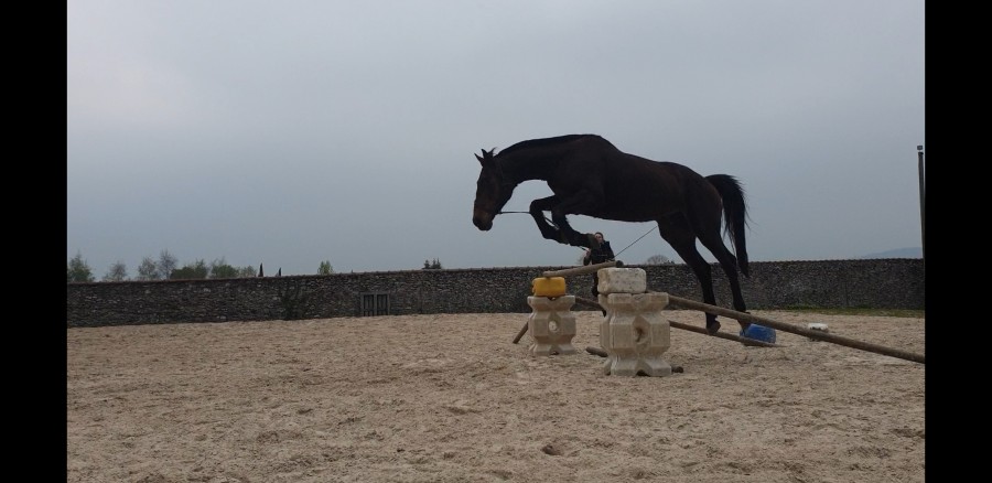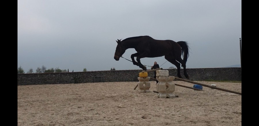 et du coup forcément vu que tout se passait très bien je me suis dit et bien on va profiter qu'il soit génial et qu'il soit sans cavalier sur le dos pour travailler un petit peu l'obstacle, j'ai juste mis un petit vertical sur les plots, abordé au trot, chose que je ne fais jamais monté car je ne suis pas à l'aise avec l'abord au trot lol, et ça se passe encore une fois superbement bien il ne prends même pas la foulée de galop devant et pousse bien avec ses fesses pour sauter.