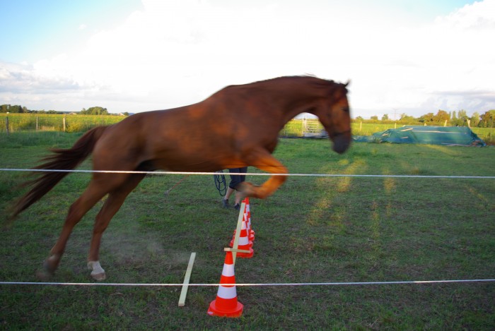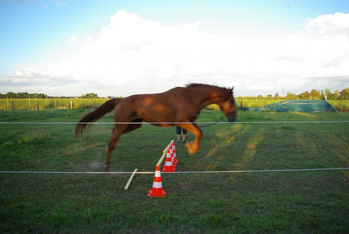 Autant dire que j'y allais souvent la boule au ventre... du coup cette fois j'ai pris mon courage à 2 mains, un licol et roule ma poule ! J'arrive au pré et siffle 2 fois, comme d'habitude, morue arrive tranquillement. Un rapide rappel de respect dans le pré et on sort. Avant d'arriver sur la route, plus pour souffler un coup que pour une véritable raison de respect je pense