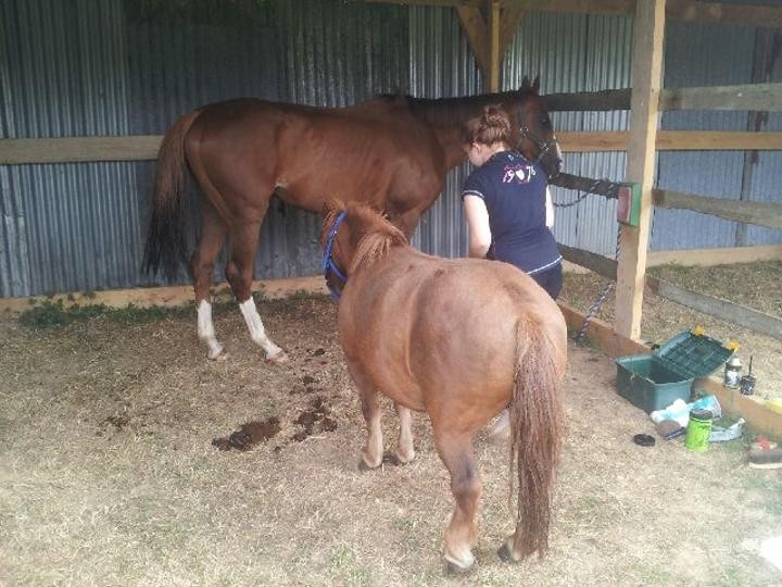 De notre côté, j'ai voulu travailler Eternity en carrière. Déjà, en allant la chercher au pré, elle faisait la gueule, genre "oh mince, t'es arriver..." lol. Et puis en l'emmenant elle s'est fait coller au cul par le SF, il est fou dingue d'elle XD. Je la sors du pré, l'attache pour la panser et là, le SF en panique de la voir si loin (moins de 2 mètres lol) Elle, imperturbable le regardait d'un air de dire "mais tu vas te taire toi oui?" Mais du coup, impec pour tout le pansage, même le postérieur droit n'a pas poser pb, alors que d'habitude elle rechigne un peu (normal, c'est le dernier que je lui ait appris).