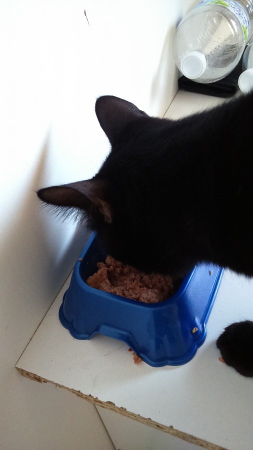 Quand il a sentit les croquettes, il est devenu fou. La pâté, j'vous raconte même pas... Il a finit par se rationner seul sur la pâté. Il l'a mangé en deux fois. Au moins, ça à l'air de lui suffire, d'être au mixte...