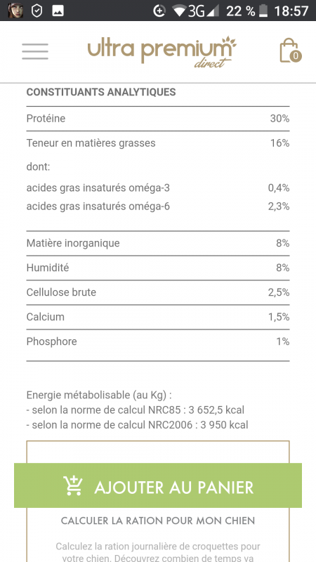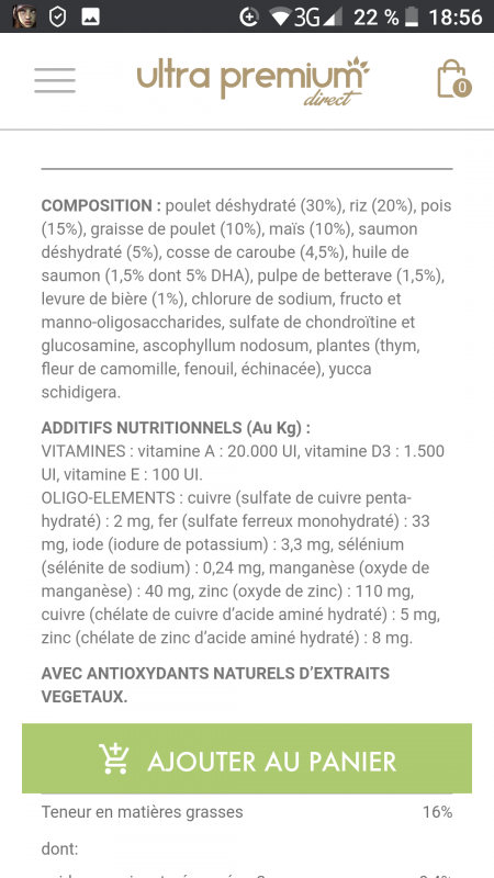 Taurine (mg/kg) 2200, EPA/DHA (%) 0.23, Manganèse (mg/kg) 35, Zinc (mg/kg) 75, Iode (mg/kg) 2, Selenium (mg/kg) 0.2, Cuivre (mg/kg) 11, Fer (mg/kg) 110,