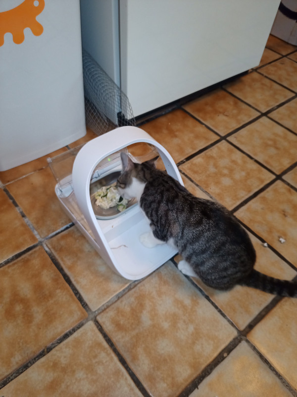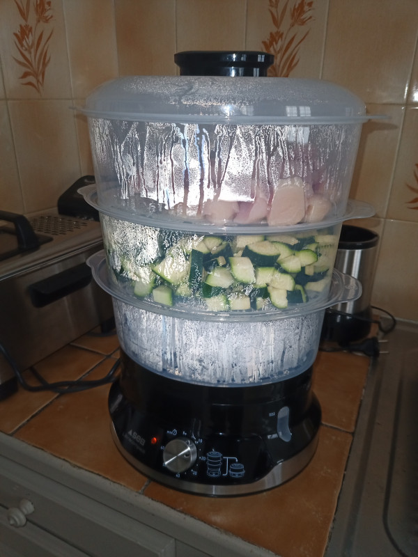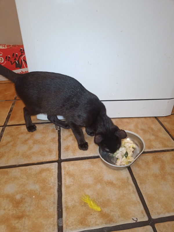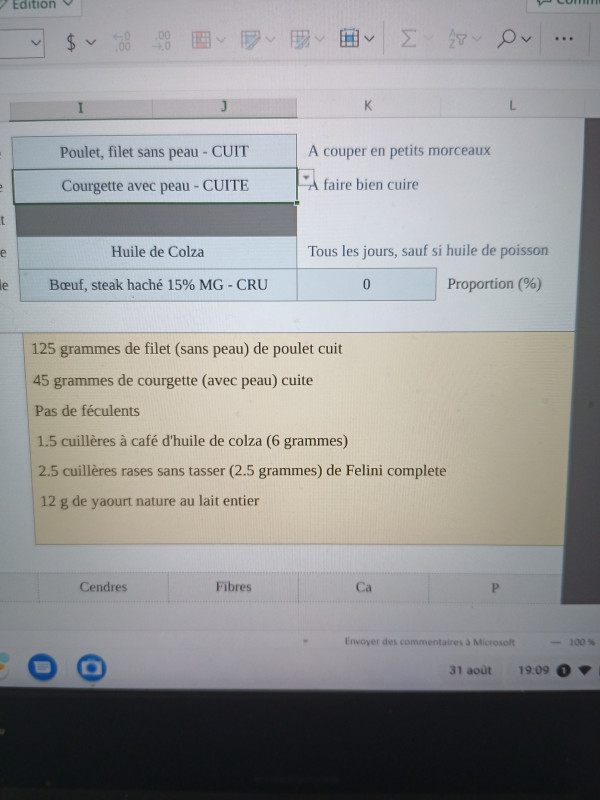 Au menu : blanc de poulet et courgette cuits vapeur, felini complète en CMV, huile de colza et yahourt nature entier fait maison plus 1 oeuf de caille par semaine.
